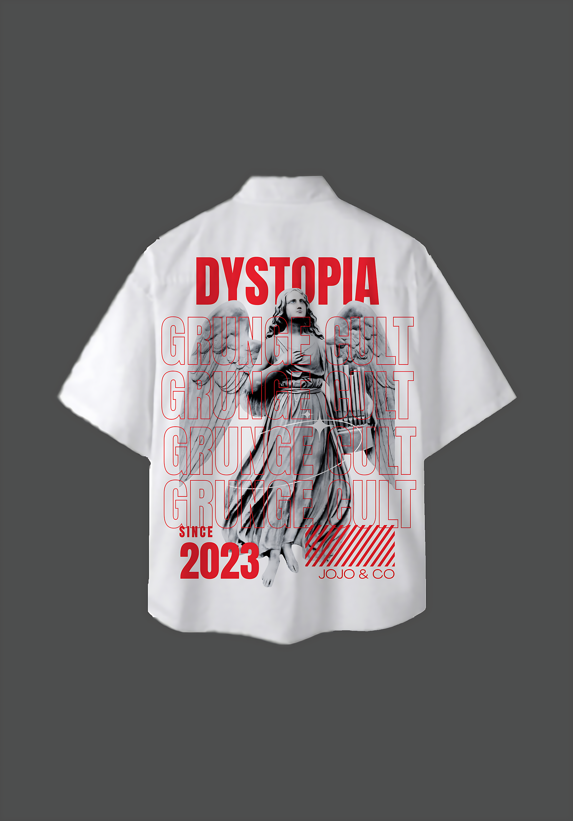 Crafted from premium French terry cotton, the Red Bolt Shirt by Jojo & Co offers a relaxed fit that ensures comfort without sacrificing style. The clean white button-up design features practical chest pockets and is distinguished by twin red lightning bolts across the front—emblems of raw power and electric individuality. The back presents a compelling greyscale angel statue framed by layered red typography reading ‘GRUNGE CULT,’ seamlessly integrating elements of chaos, art, and underground culture.